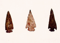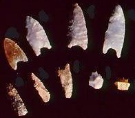 To construct a conical wigwam, the women would cut 4 or 5 long spruce poles, which were lashed at the top to form the basic frame. A flexible sapling, often striped maple, was then bent into a hoop, which was lashed inside the frame for extra support at the top. Shorter poles were then lashed to the hoop to provide greater strength and support for the covering. The frame was made so that the planned doorway faced away from prevailing winds of the area. Once the frame was completed, it was covered with pieces of birch bark. The bark was soaked in warm water to make it flexible and resistant to tearing, and holes were punched using an awl made from bone or an animal’s tooth. The bark was sewn into place using spruce root, which is very flexible and tremendously strong. They would start at the bottom of the wigwam, at both edges of the doorway, and overlap the pieces as they worked around to the back. They would then begin the next row. In this way, the bark overlapped like shingles to shed both rain and wind. An opening was left at the top for smoke to escape, but a separate collar of bark was made to close up this opening in the event of a storm. Finally, additional short poles were laid against the bark to help keep it in place, and the doorway was covered with a hide. Inside the wigwam, a rock fireplace stood in the center to provide heat and light. The floor was generally covered with fir boughs, which provided a springy surface for sleeping. In the winter, there would be time enough for the women to decorate the wigwam with various designs of birds, moose, otters and beavers. If additional ventilation was required, short poles would be wedged under the pieces of bark, creating openings to capture the breeze. Besides the wigwam, other more make-shift structures included lean-tos and snow shelters consisting of hollows covered with fir branches and containing a central fire. TOOLS AND IMPLEMENTS The Mi'kmaq worked stone into various tools, including scrapers, points, knife blades, axes and adzes. Stone was either knapped (flaked by controlled pressure) or was pecked (struck with a harder stone and chipped) and ground into the desired shape. Some examples of stone implements are shown below, from various timeframes. They also made extensive use of bone, which is more easily shaped, but does not hold an edge as long.