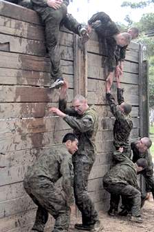There was a time, more years ago than I care to count, when I was going through Basic Training after joining the Armed Forces. As part of our training, we had to run the "Confidence" course - military speak for an obstacle course. Typical of such courses, ours had a very high wooden wall, which was deliberately made much too high for any but the strongest and most agile jumpers to climb alone. Like so many other things in Basic Training, the purpose of this obstacle was to teach us about teamwork. Here's how it worked: the first two to reach the wall boosted the third person until they could reach the top. The third person then stayed at the top of the wall, reaching down to grab the hand of the next person as they were boosted up, and helping them climb to the top. As the helpers tired, they were relieved by others, who would continue to help until everyone had succeeded in climbing over this wall. Some had an easier time than others, but nobody was left behind. This activity, and others like it, were what built the unique sense of brotherhood that all of us who served are privileged to share. We learned to depend on our brothers-in-arms, and they learned to depend on us.